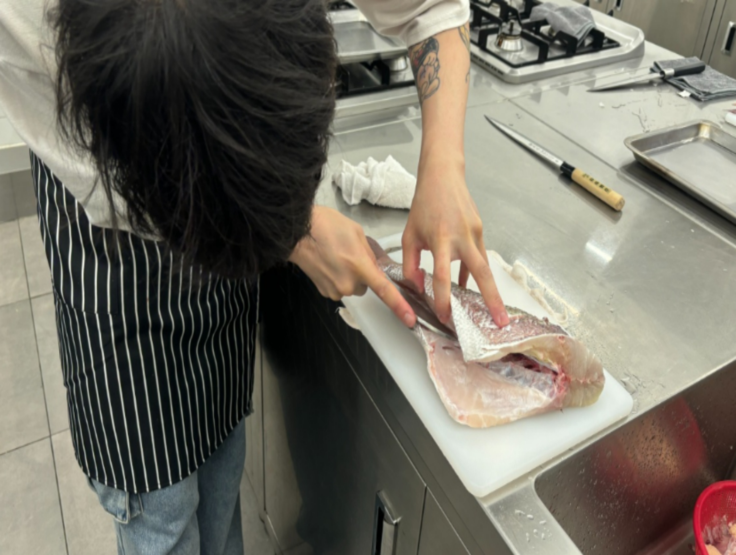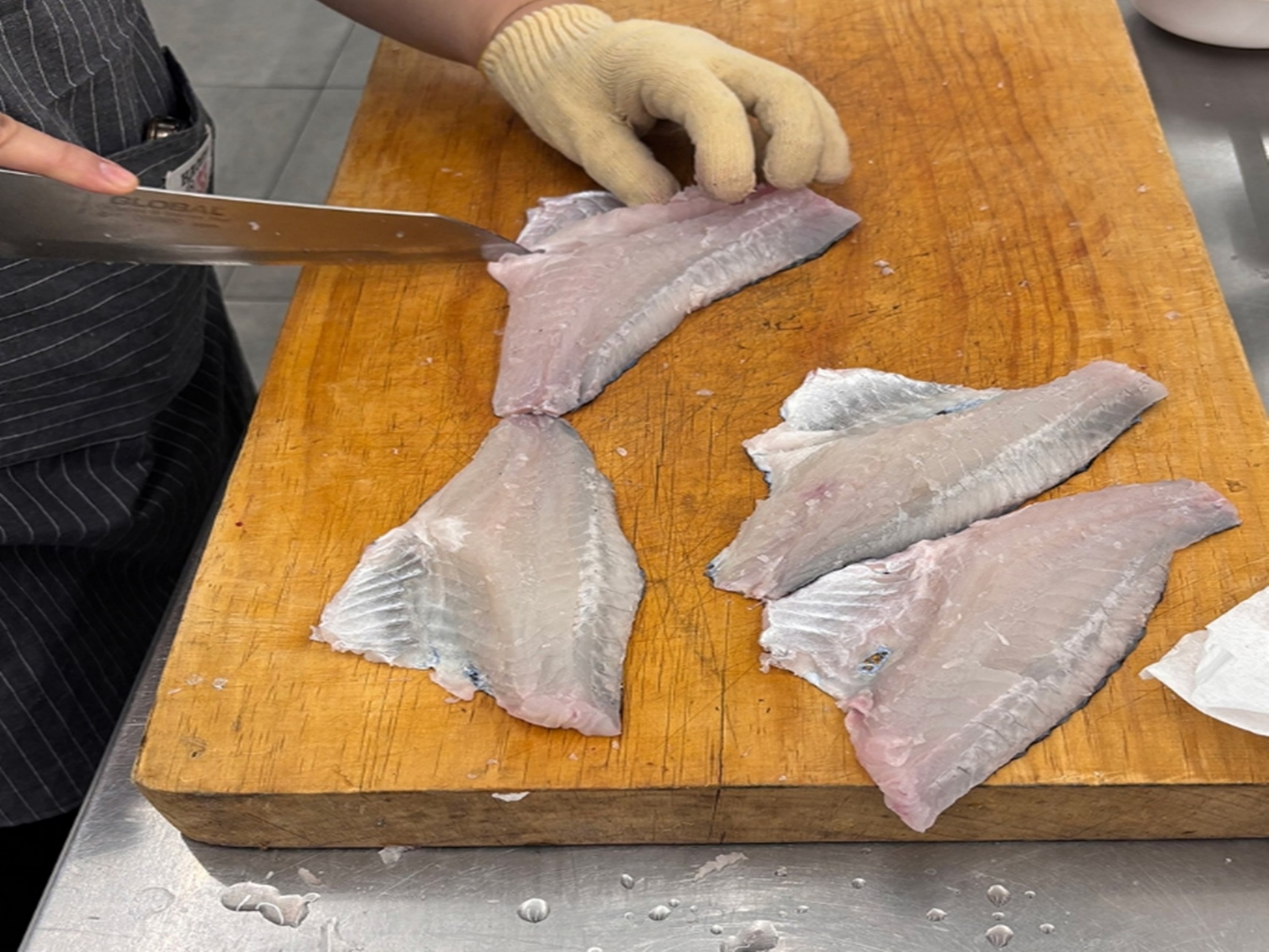 예를 들어, 광어나 도다리는 칼을 세워 얇게 써는 기술이 필요하고, 참치나 연어는 결 방향을 살려 두툼하게 썰어야 풍미가 살아납니다. 어종에 따라 칼을 대는 방향도 달라지기 때문에 이 실습은 생선의 '물성'을 이해하는 데 매우 효과적입니다.