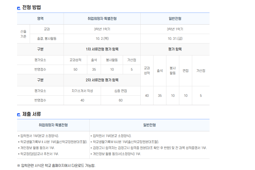 🔷 1차 서류전형: 교과성적(3학년 1학기) 50점 + 출석률 35점 + 봉사활동 10점 + 가산점 5점 = 총 100점