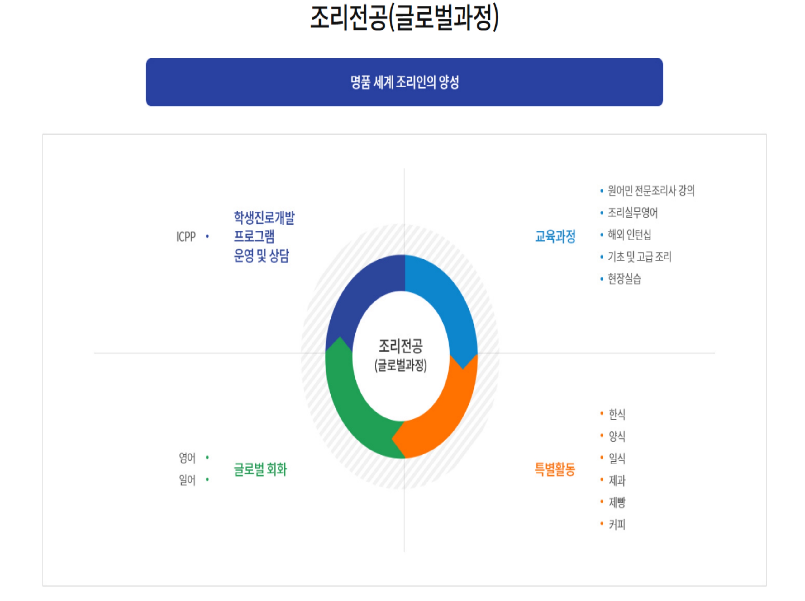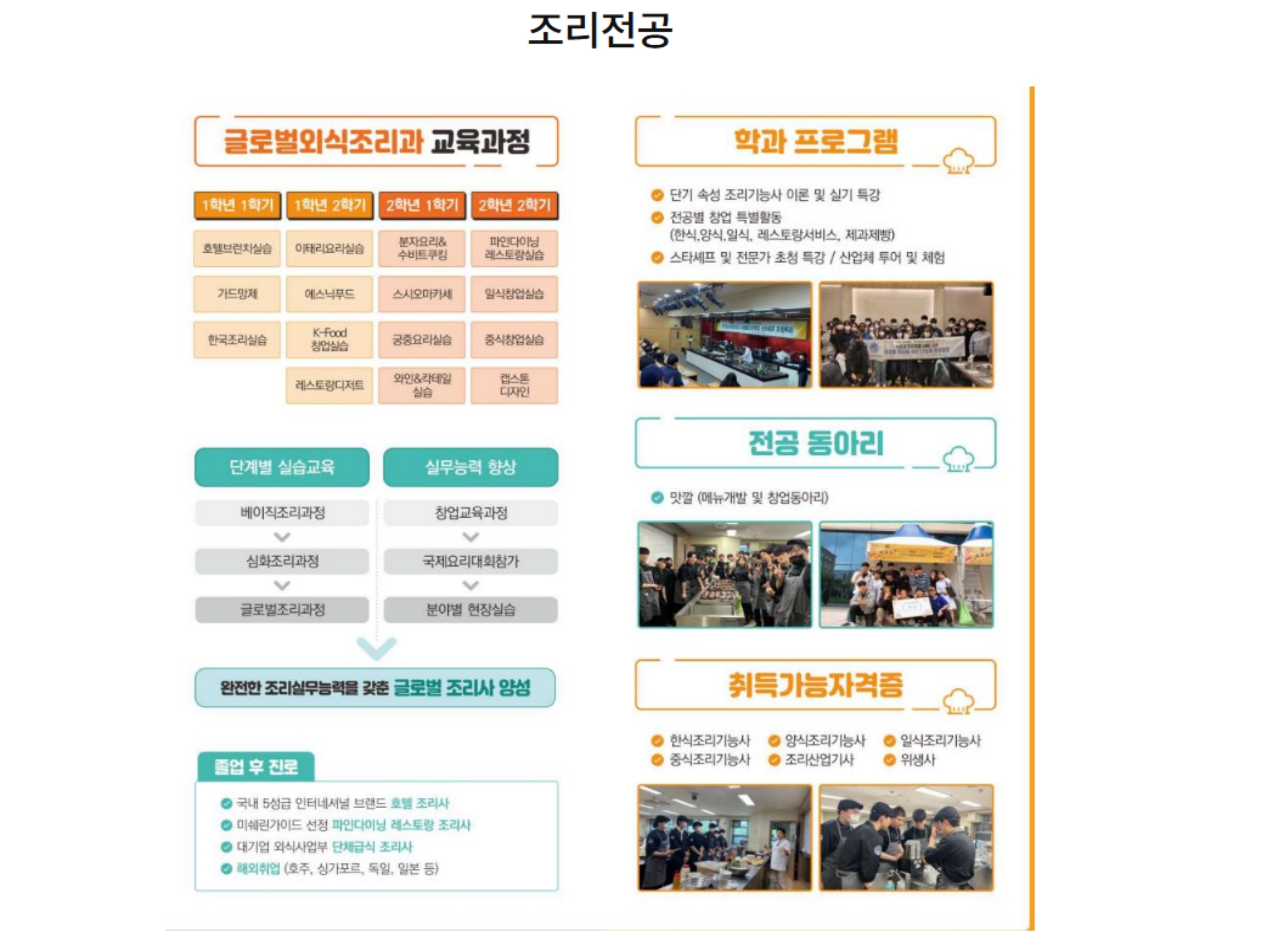 🔷 글로벌 외식조리과에서는 한식·양식·중식·일식은 물론, 제과제빵과 커피·칵테일까지 폭넓게 배울 수 있습니다. 특히 해외 인턴십, 원어민 셰프 수업, 맞춤형 현장 실습 등을 통해 글로벌 인재 양성을 목표로 하고 있어요.